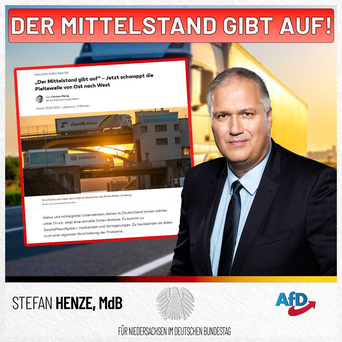 Die Pleitewelle wandert von Ost nach West, dank Bürokratie und Regierungs-Versagen! Tausende Firmen sind pleite, die Jobs weg und Merz tut nichts. Die AfD ist die Stimme des Mittelstands: Weniger Steuern, weniger Regulierungen, mehr Freiheit!